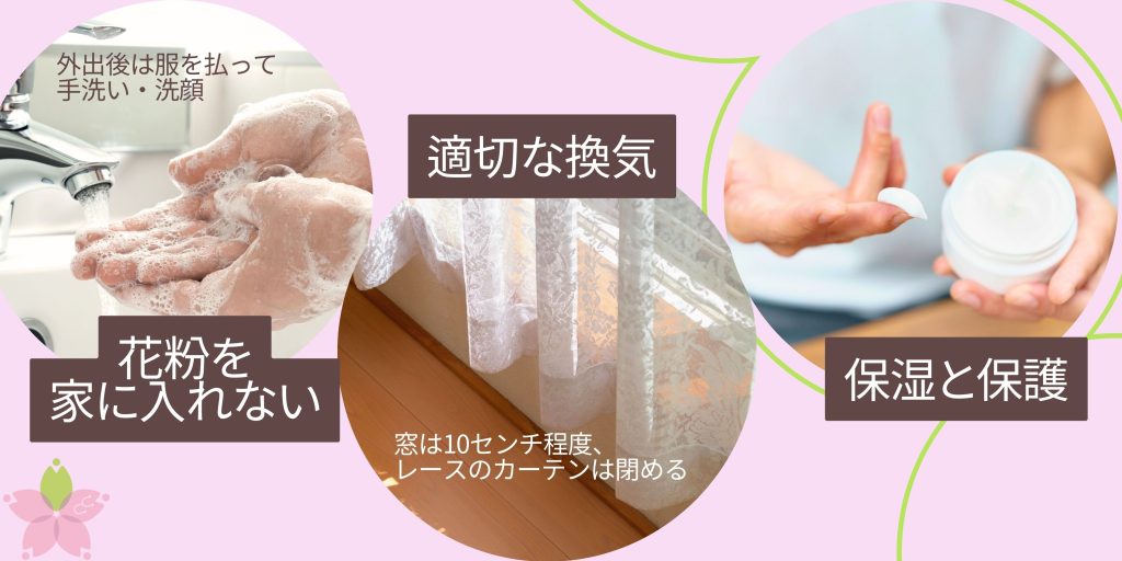 - 花粉を家に入れない: 帰宅時は玄関前で衣服を払い、すぐに洗顔やうがいをしましょう。