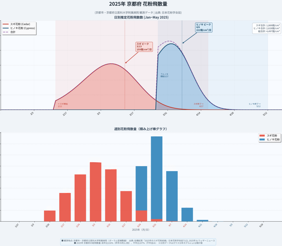 環境省や厚生労働省のデータによると、京都府内では例年2月中旬からスギ花粉の飛散が本格化します。