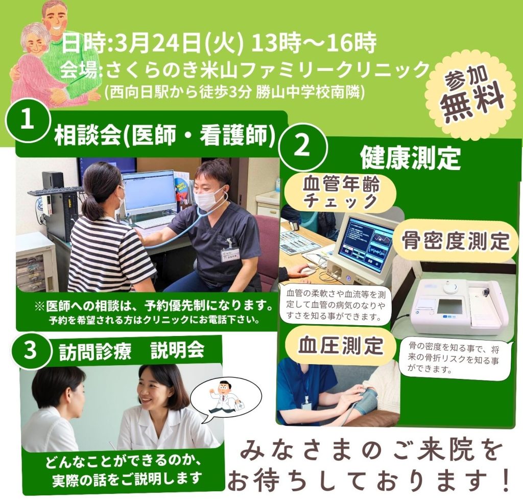 向日市のさくらのき米山ファミリークリニックでは、3月24日(火)13時より、地域の皆様の健康をサポートする健康相談会を開催いたします。