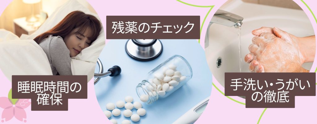 - 残薬のチェック: 血圧や糖尿病など、継続的な治療が必要な方は、連休中に薬が切れないよう、今のうちにカレンダーと薬の数を確認してください。