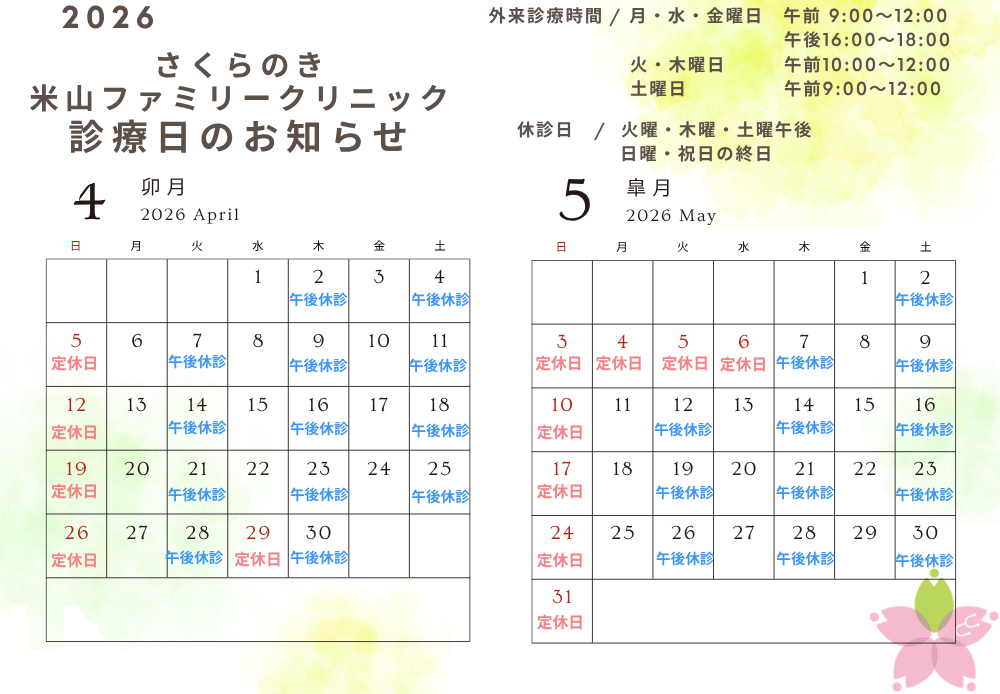 4月は入園・入学などの新生活による疲れが出やすく、体調を崩しやすい時期です。さくらのき米山ファミリークリニックでは、ゴールデンウィーク(GW)期間中も地域の皆様が安心して過ごせるよう、事前予約を推奨した診療体制を整えています。